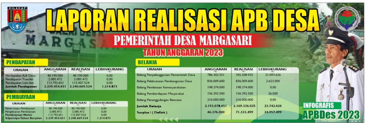 Laporan Realisasi Anggaran Pendapatan dan Belanja Desa (APB Desa) Margasari Tahun 2023 merupakan dokumen penting yang menyajikan informasi tentang pendapatan yang diterima dan belanja yang dilakukan oleh Desa Margasari Kec. Sidareja dalam suatu Tahun Anggaran 2023. Laporan ini disusun sebagai bentuk transparani anggaran agar setiap warga masyarakat mengetahuinya.